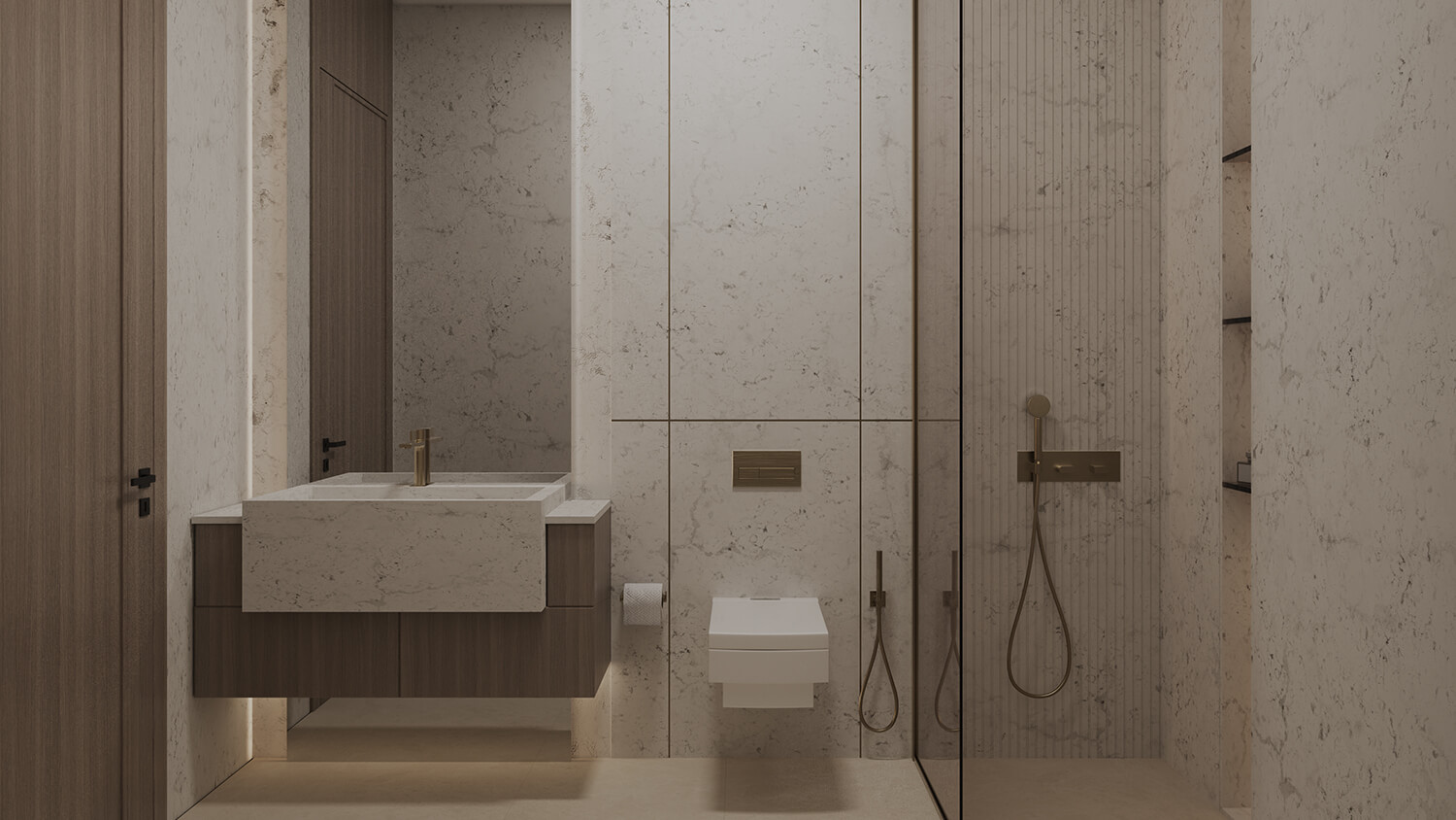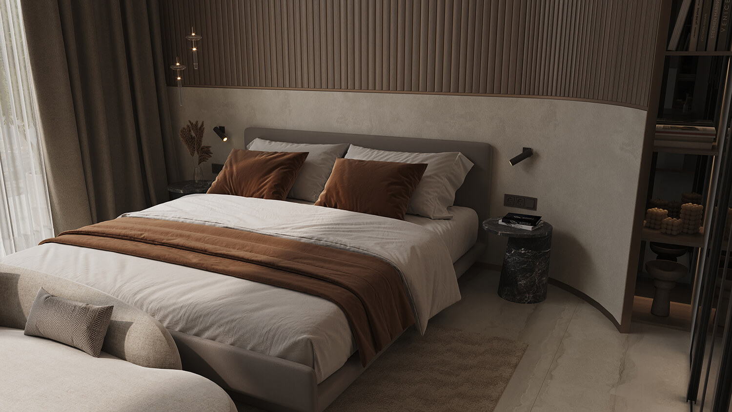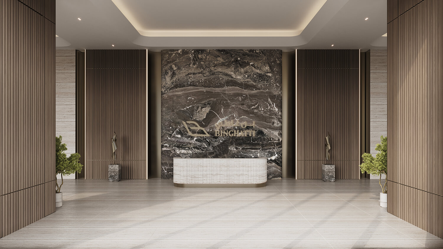 The interior design embodies luxury with sleek metal accents, warm Oak Wood, elegant Travertine, and sophisticated Brushed Brass and Bronze Mirror accents.