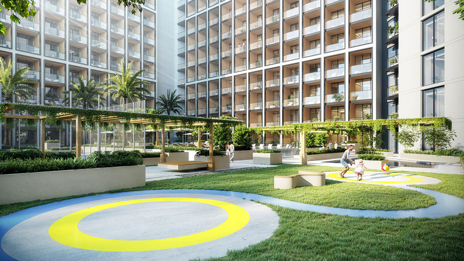 Kids' play area, jogging track, and plentiful outdoor seating.